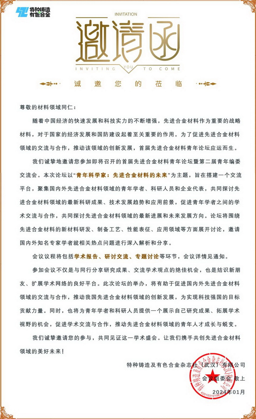 (2)论文投寄:欢迎电子邮件投稿,或网上在线投稿,论文右上角请注明“2024年先进合金论坛征文”,投稿邮箱:tzzz@special-cast.com,网址:www.special-cast.com;
