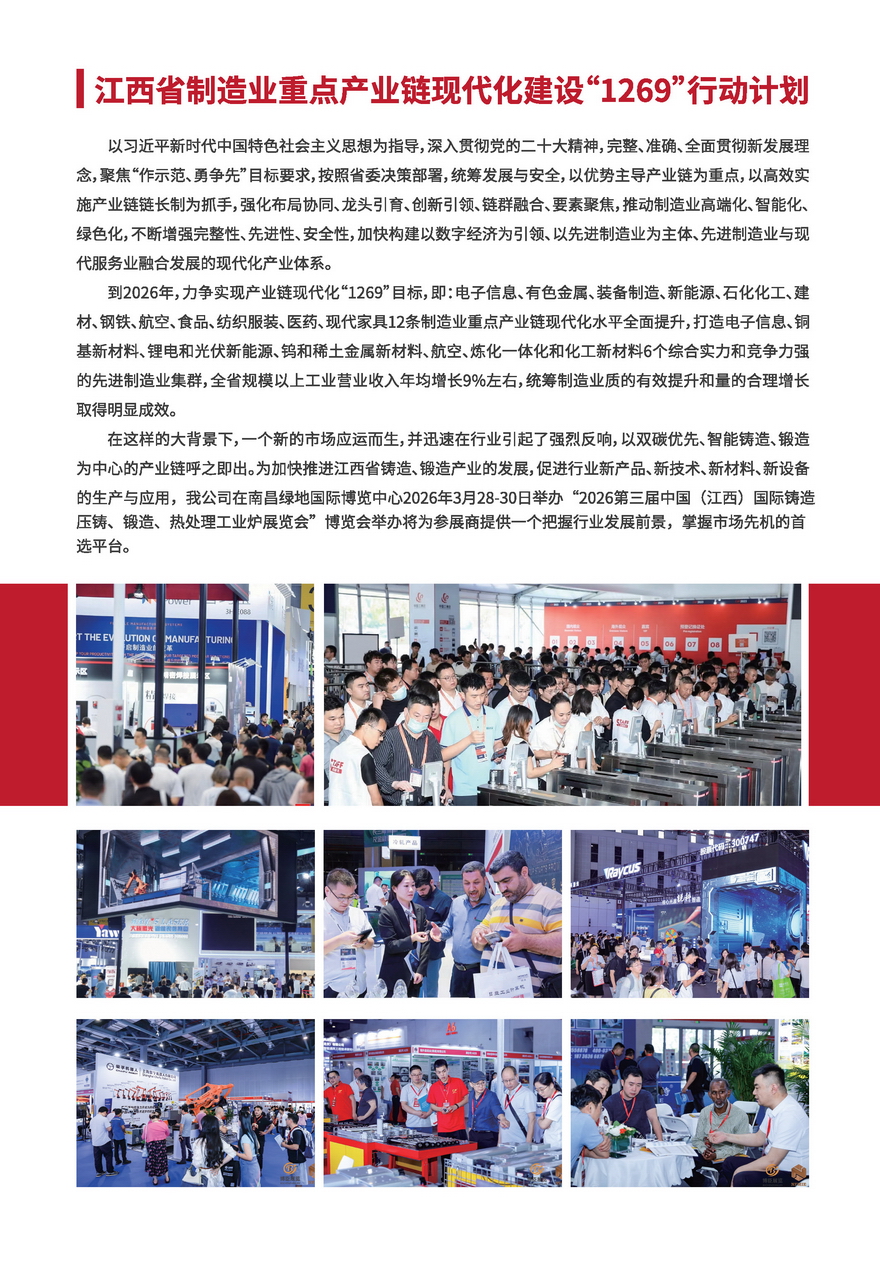 在这样的大背景下,一个新的市场应运而生,并迅速在行业引起了强烈反响,以双碳优先、智能铸造、锻造为中心的产业链呼之即出。为加快推进江西省铸造、锻造产业的发展,促进行业新产品、新技术、新材料、新设备的生产与应用,我公司在南昌绿地国际博览中心2025年11月23-25日举办“2025中国(江西)国际铸造压铸、锻造、热处理工业炉展览会”博览会举办将为参展商提供一个把握行业发展前景,掌握市场先机的首选平台。
