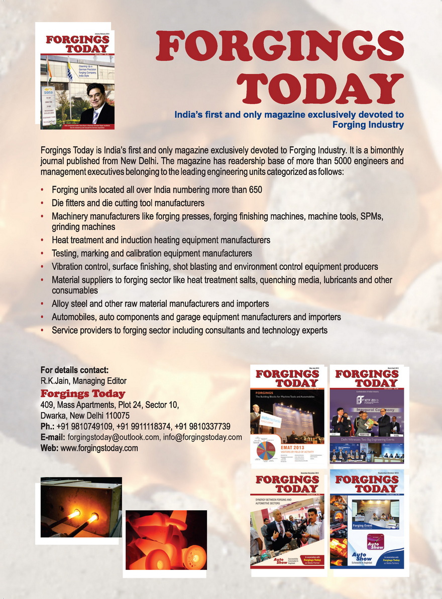FORGINGS TODAY is India first and only magazine exclusively devoted to metal forging and allied industrial sectors. Forgings Today, a bimonthly publication, provide a platform to all stake holders to share information. While retaining its identity primarily as a print media, it would not be limited to that. Forgings Today’s long term vision includes dissemination of information through Seminars, Workshops, Conferences, Exhibitions, other audio visual means.
