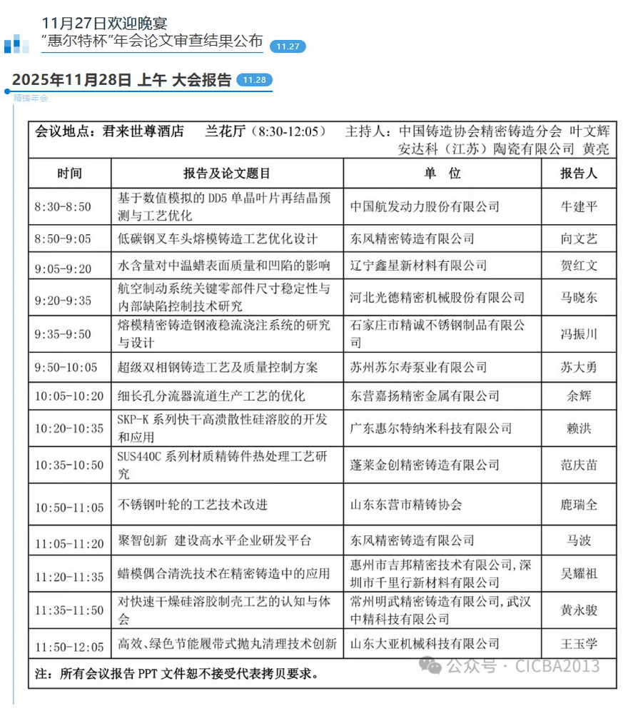 2025第十八届中国铸造协会精密铸造分会年会会议日程安排