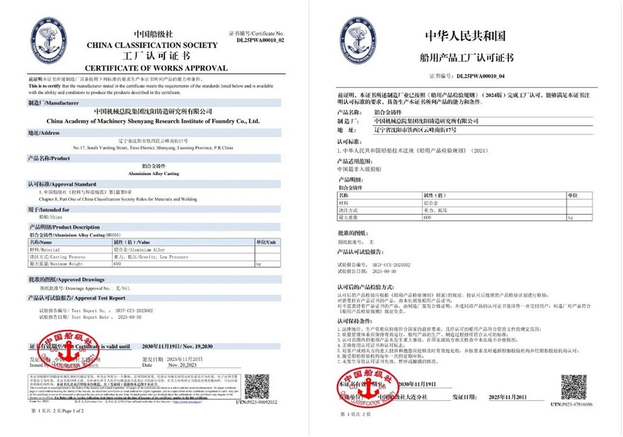 沈阳铸造研究所顺利取得铸钢件和铝合金铸件的中国船级社认可证书