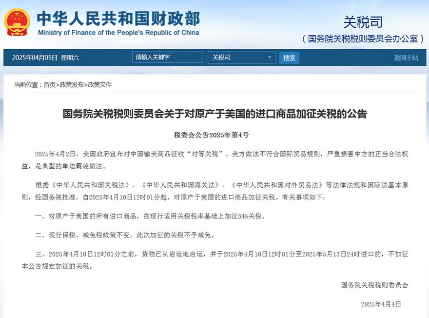根据《中华人民共和国关税法》、《中华人民共和国海关法》、《中华人民共和国对外贸易法》等法律法规和国际法基本原则,经国务院批准,自2025年4月10日12时01分起,对原产于美国的进口商品加征关税。有关事项如下: