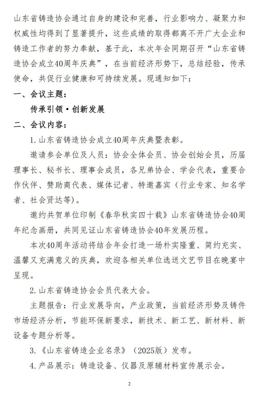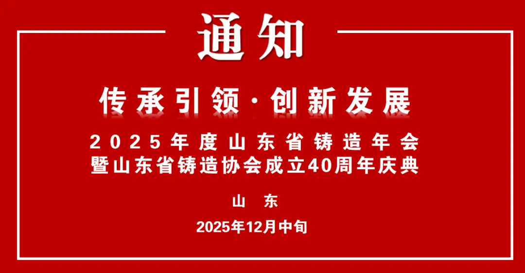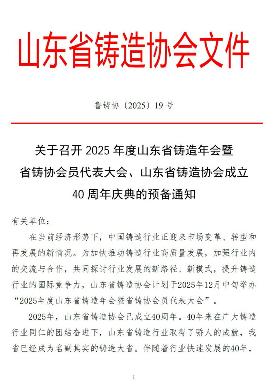 关于召开2025年度山东省铸造年会暨省铸协会员代表大会、山东省铸造协会成立40周年庆典的预备通知