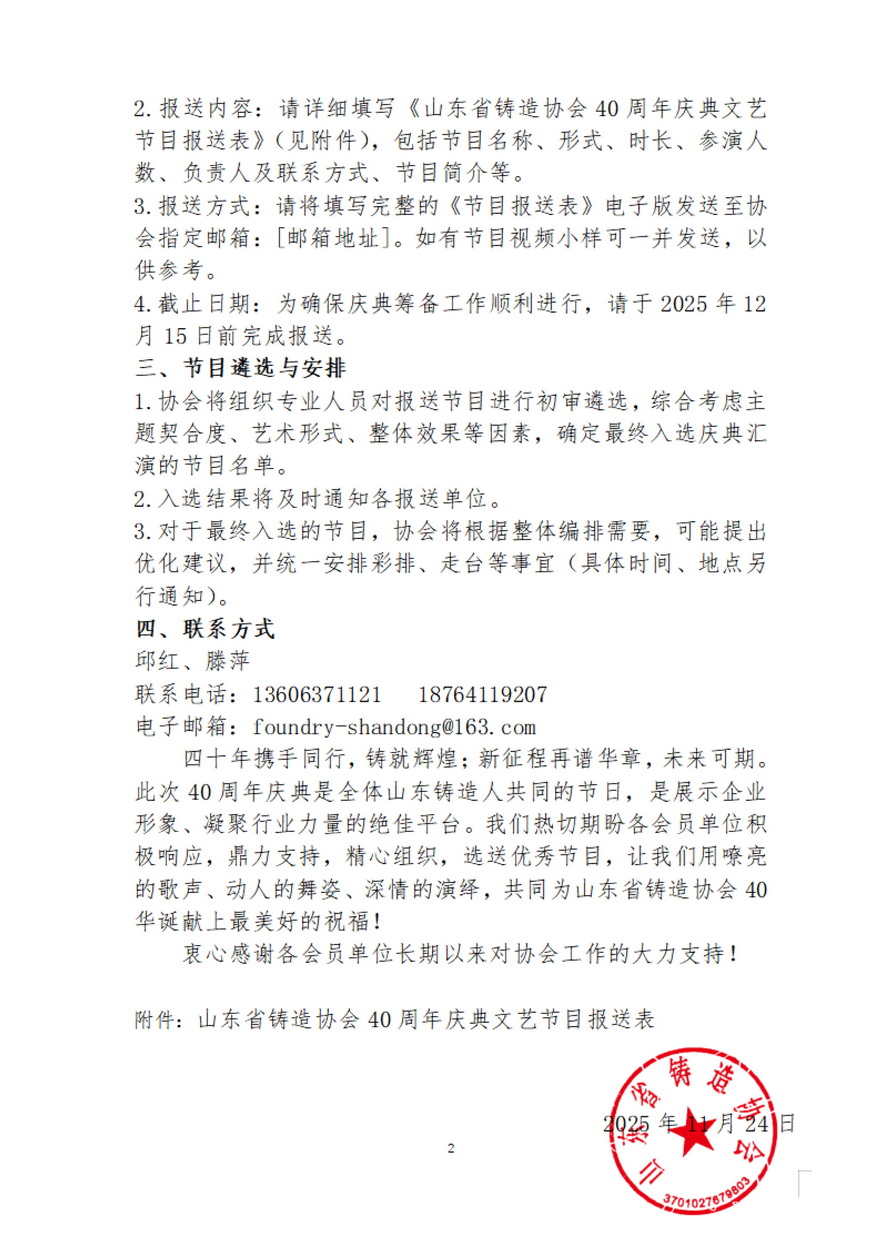 关于选送节目共庆山东省铸造协会成立40周年的 邀请函