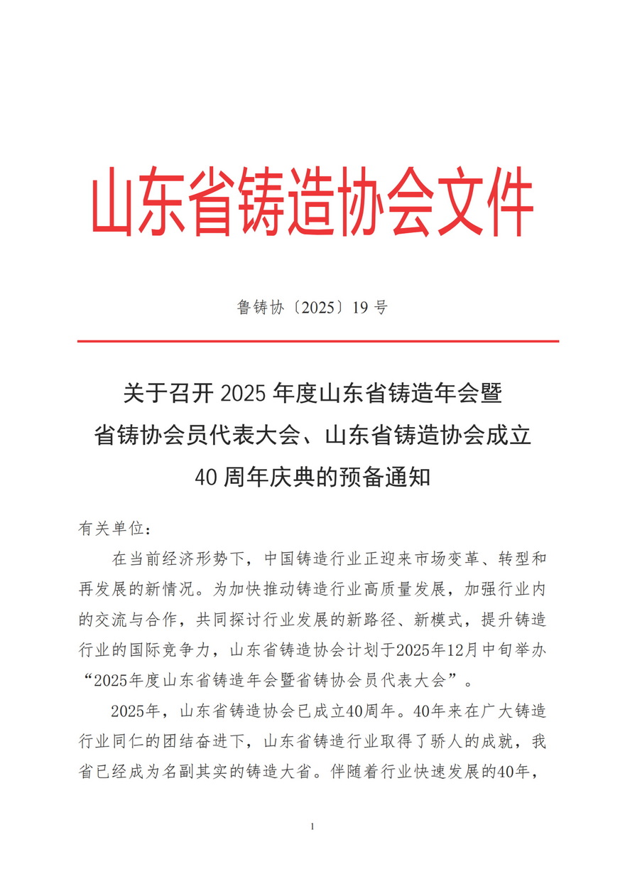 关于召开2025年度山东省铸造年会暨省铸协会员代表大会、山东省铸造协会成立40周年庆典的预备通知