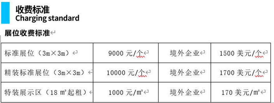 2. 精标展位基本配置:3m×3m展位(包括精装标准展台、布幅广告门楣、地毯、一桌两椅、门楣射灯、展位射灯、220V电源插座);