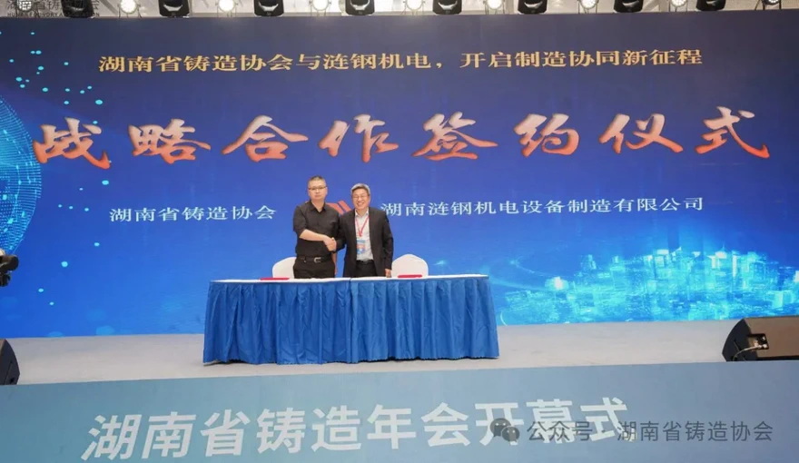 2.同时,湖南省铸造协会与湖南涟钢机电设备制造有限公司也举行了签约仪式。湖南省铸造协会秘书长周建明、湖南涟钢机电设备制造有限公司总经理彭建华分别代表双方签署战略合作协议框架。双方将以此次合作为契机,在技术研发、产品创新、市场拓展等领域开展广泛合作,实现优势互补、互利共赢,为推动湖南铸造行业整体发展贡献力量。