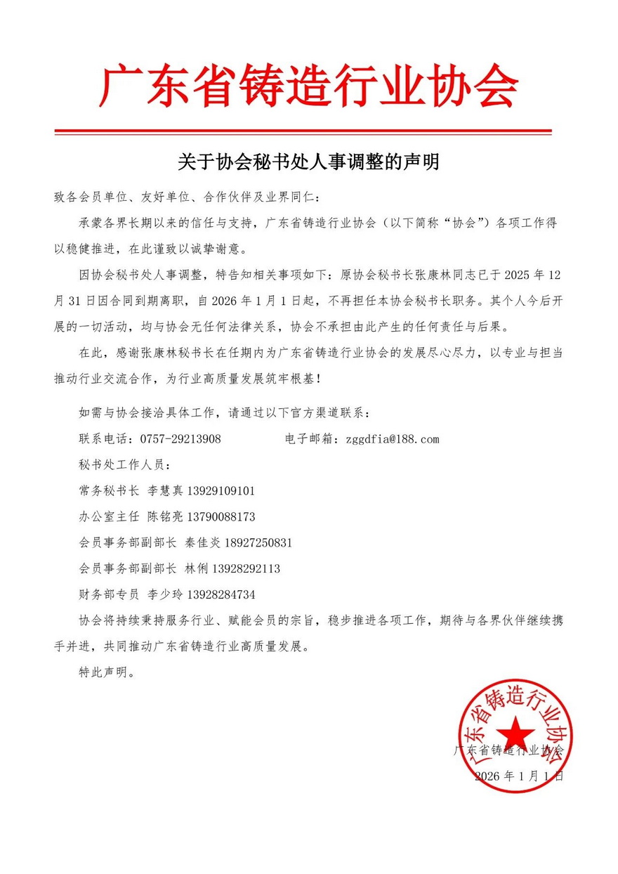因协会秘书处人事调整,特告知相关事项如下:原协会秘书长张康林同志已于2025年12月31日因合同到期离职,自2026年1月1日起,不再担任本协会秘书长职务。其个人今后开展的一切活动,均与协会无任何法律关系,协会不承担由此产生的任何责任与后果。