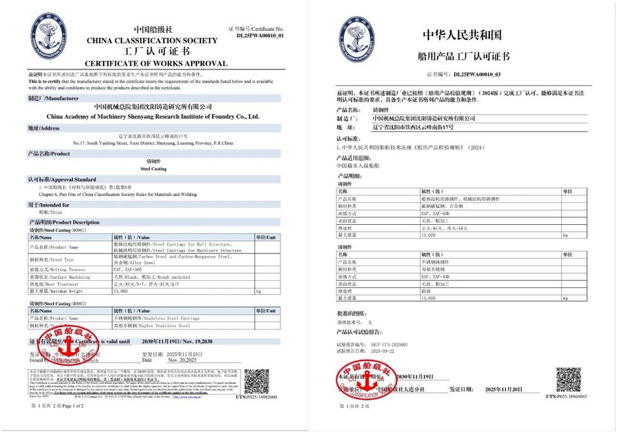 沈阳铸造研究所顺利取得铸钢件和铝合金铸件的中国船级社认可证书
