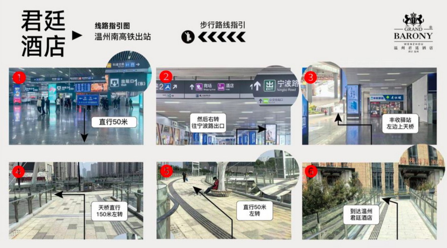 出站口直行至服务台处右转至天桥入口,沿天桥步行 5-10分钟直达酒店二层大酒店