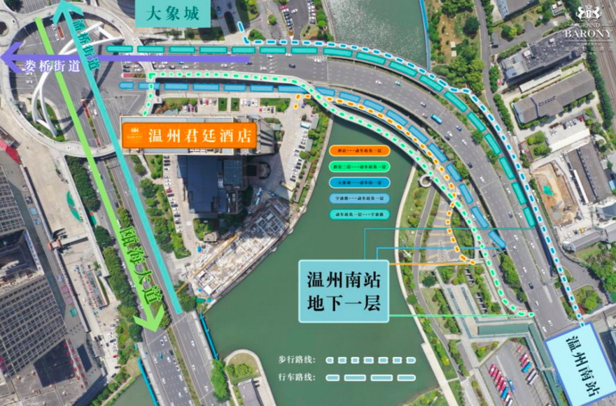 (2)公交线路: 由火车温州站广场站乘坐B102路车到温州大象城站下车沿天桥步行至酒店。