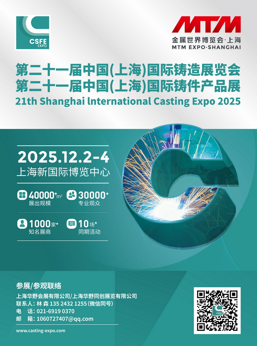 FSC通过主办方了解到,20025第二十一届上海国际铸造展览会、第二十一届上海国际铸件产品展将于2025年12月2日-4日在上海新国际博览中心 E7馆/E6馆/N5馆(浦东新区龙阳路2345号)举办,预计1000家铸造及相关企业齐聚,展览面积40000平方米,超过30000名专业观众。本届展会将以“国际化、专业化、高层次”的要求,邀请中国和世界铸造厂家展示新产品、新技术、新设备,从而帮助业界高层全面了解全球铸造产业链的最新趋势,同时为观众打造产品、材料和设备的一站式采购平台!