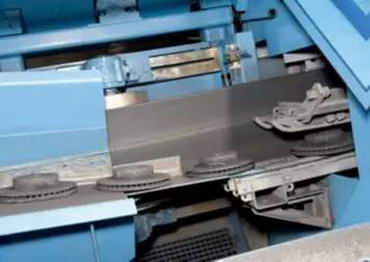 在冷却及离开浇注系统后,排列好的工件会被传送到连接至抛丸机的输送系统,工件在此从水平位置移动到倾斜位置,并单独进入抛丸机。系统采用模块化设计,并可配备7、12或14个抛丸器(位于机器本体三个侧面),具体取决于作业能力要求。
